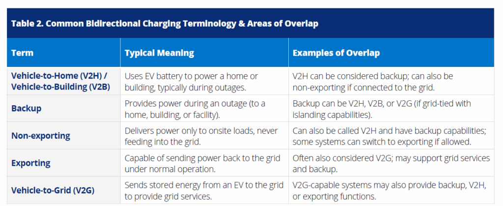 To help clarify the often-confusing terminology that utilities, manufacturers, and customers use to describe bidirectional charging, SEPA includes Table 2, which maps the most common terms, such as Vehicle-to-Home, backup, non-exporting, and Vehicle-to-Grid, and shows where these categories overlap. This table serves as a quick reference for regulators developing consistent definitions and determining when interconnection is required.